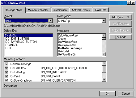 Итак, вы связали кнопки Say Hello и EXIT с событием BN_CLICKED. При нажатии на кнопку Exit программа завершается, а при нажатии на кнопку Say Hello выводится сообщение "Say Hello".
