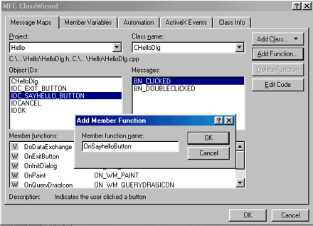 Теперь свяжем кнопку Say Hello с событием BN_CLICKED. Для этого зайдем в меню VIEW->ClassWizard.