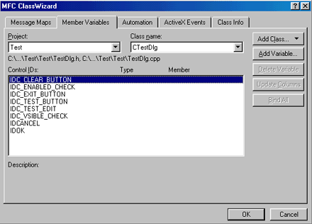 Class Name - название класса, элементы которого вы будете связывать с переменными. Убедитесь в том, чтобы был выбран класс CTestDlg, потому что именно он отвечает за диалоговую панель, которую вы только что проектировали.