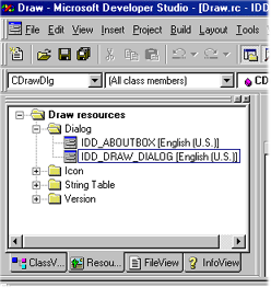 Сейчас мы визуально спроектируем диалоговую панель. Для этого вначале выбирете закладку "Resourse View" и раскройте пункт Draw Resource, как показано на рис. 1.5.