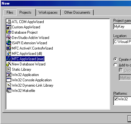 Выберем там MFC AppWizard(exe), это значит вы хотите создать запускаемый файл.