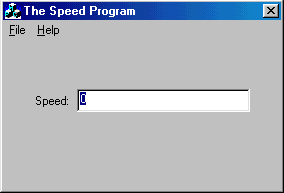 Программа Speed основана на диалоговом окне, оснащенном меню: File и Help, в середине главного окна, расположено окно редактирования, в котором можно вводить только числа, а, если зайти в меню File->Current, то появится окно сообщения показывающее число в окне редактирования.