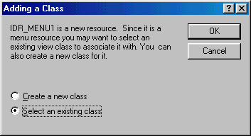 Теперь, когда меню визуально спроектировано, его надо связать с диалоговой панелью, для этого меню вы добавите в класс диалоговой панели. Для этого выберете мастер ClassWizard в меню View, в ответ Visual C++ выведет вам диалоговою панель Adding a class(добавление класса):