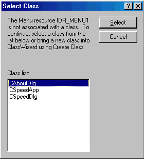 Раскроется еще одно окно Select Class(выбрать класс), выбирите класс CSpeedDlg, отвечающий за диалоговую панель, не отавляйте установки по умалчанию!