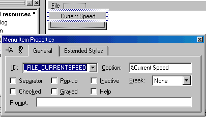 Теперь опять зайдите в Properties, можно использовать комбинацию клавиш ALT+ENTER, и посмотрите в ID, вы увидите там запись ID_FILE_CURRENTSPEED - это интендификатор пункта меню Current Speed, с помощью него вы сможете связывать этот пункт меню с событиями. Этот итендификатор Viusal C++ сгенерировал сам.