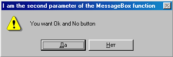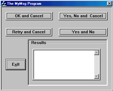 Программа MyMsg основана на диалоговом окне. Программа предназначена для того, чтобы при нажатии на определенные кнопки выводилось диалоговое окно, в котором будет предлагаться нажать вам на кнопки с определенным значением. На пример, если в главном окне вы щелкаете на кнопку "Yes and No". То выдается такое диалогвое окно: