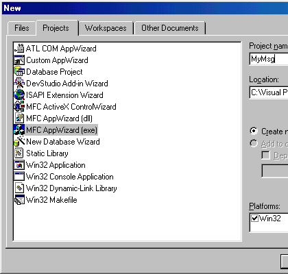 Выберем там MFC AppWizard(exe), это значит вы хотите создать запускаемый файл.