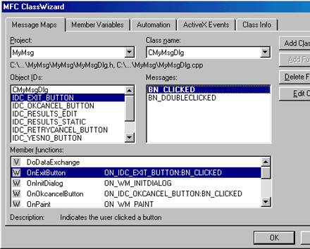 Связывание кода с событием BN_CLICKED кнопки "OK and Cancel"