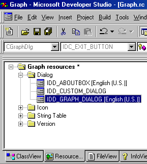 Сейчас мы визуально спроектируем диалоговую панель. Для этого вначале выбирете закладку "Resourse View" и раскройте пункт Graph Resource, как показано на рис.